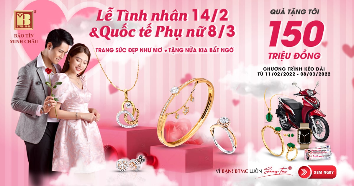Đáp ứng nhu cầu mua sắm trang sức dịp lễ Tình nhân 14/2 và Quốc tế Phụ nữ 8/3, Bảo Tín Minh Châu triển khai chương trình “Trang sức đẹp như mơ - Tặng nửa kia bất ngờ” với hàng ngàn mẫu trang sức biểu trưng cho tình yêu, phù hợp làm đẹp và thay lời chúc ngọt ngào dành tặng người trân quý. Đặc biệt, chương trình bốc thăm trúng thưởng với tổng giá trị lên tới 150 triệu đồng chỉ có ở Bảo Tín Minh Châu.