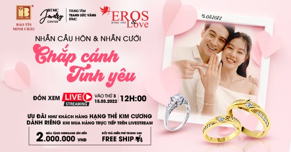 Cặp đôi muốn sở hữu kỷ vật tình yêu với mức giá ưu đãi từ nhãn hàng EROS&Love của Bảo Tín Minh Châu chưa bao giờ dễ dàng hơn thế. Chỉ cần click xem livestream, đa dạng mẫu trang sức cưới, nhẫn cưới EROS&Love sẽ đồng hành cùng chàng trai - cô gái.