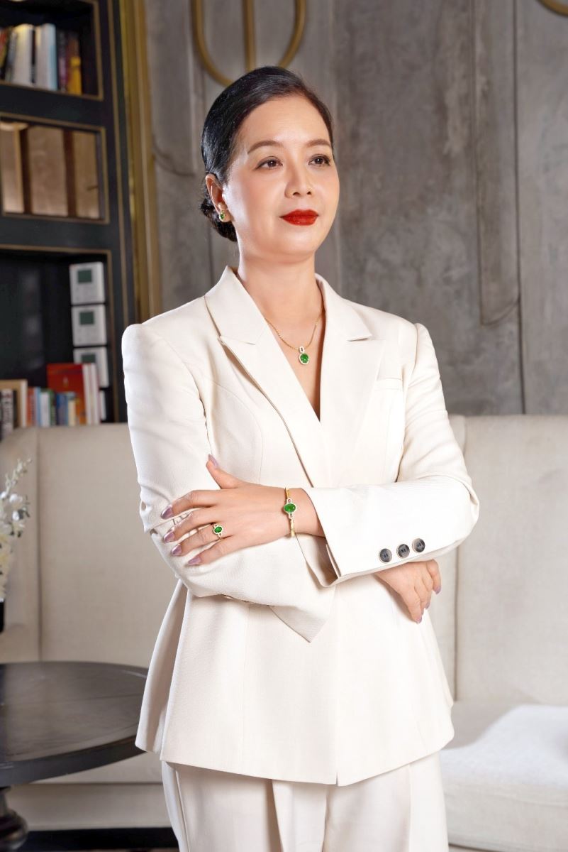 Dù chỉ diện bộ vest trơn đơn giản, NSƯT Chiều Xuân đã biến tấu nâng tầm trang phục với trang sức đá quý màu nổi từ BTMC. Chi tiết trang sức nhỏ xinh, chế tác tinh tế ôm trọn viên đá chủ Peridot làm nổi bật thần thái sang trọng, thanh lịch của nữ nghệ sĩ.