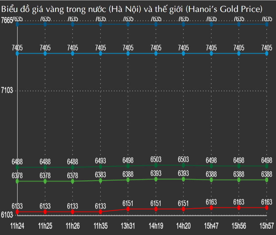 Đồ thị giá vàng thế giới trong phiên hôm nay có hướng đi lên, biến động không đồng nhất vào các thời điểm trong ngày. Cùng chiều với thế giới, đồ thị giá vàng SJC có hướng đi ngang ổn định và Vàng Rồng Thăng Long  có hướng đi lên, biến động ở từng thời điểm.