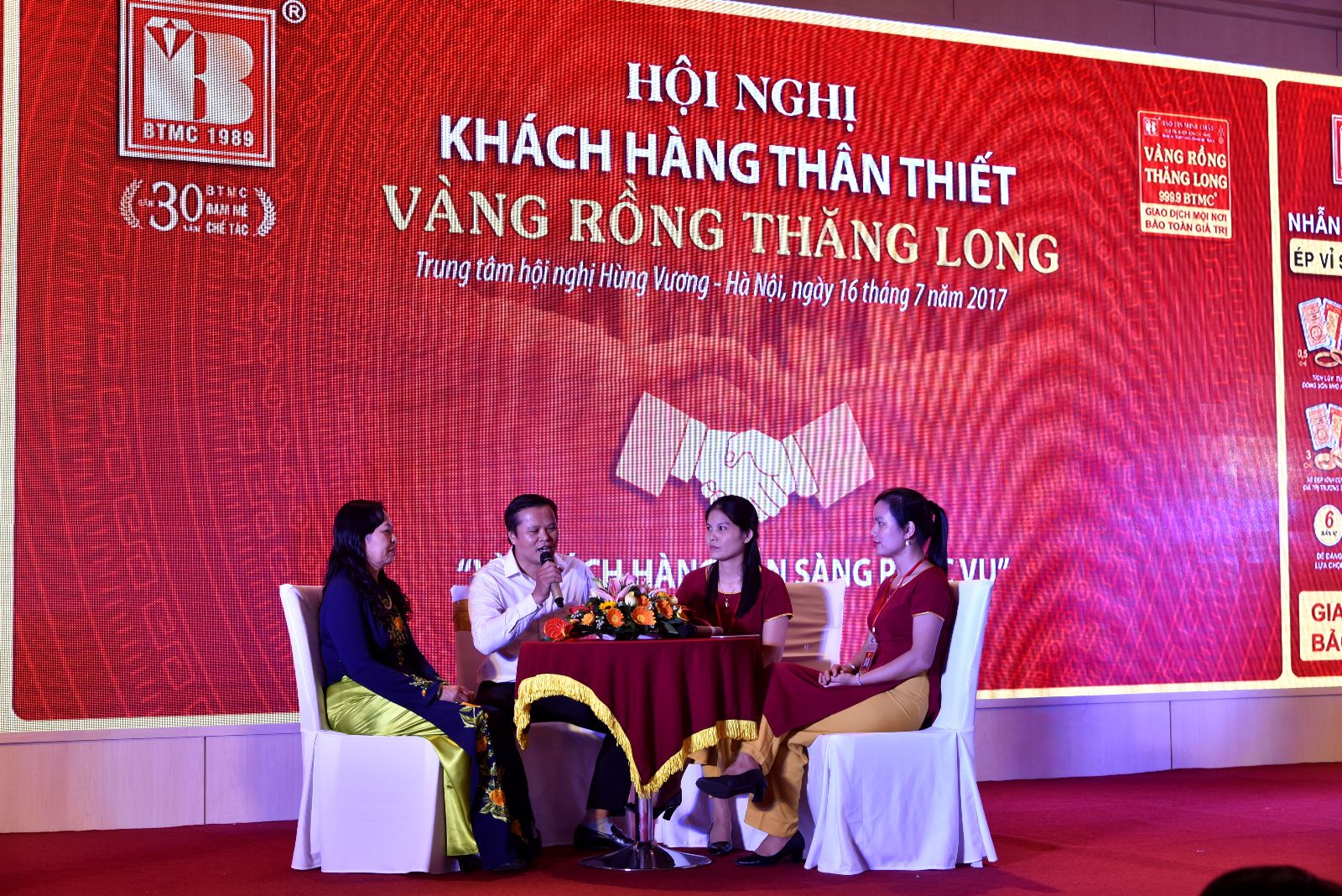 Buổi tọa đàm có chuyên gia là ông Trần Hữu Đang – trưởng phòng phân tích – Tổng Công ty Vàng Agribank Việt Nam cùng các cán bộ BTMC đã giải đáp những câu hỏi của các khách hàng và chia sẻ nội dung liên quan đến thị trường vàng, sự ổn định của vàng Rồng Thăng Long so với các vàng trao đổi khác trên thị trường; Và những lời khuyên bổ ích đối với các vị khách hàng khi lựa chọn mua vàng tích trữ như thế nào; các nội dung giải thích tại sao Vàng Rồng Thăng Long lại có những lợi  ích vượt trội so với các sản phẩm cùng dạng khác trên thị trường…