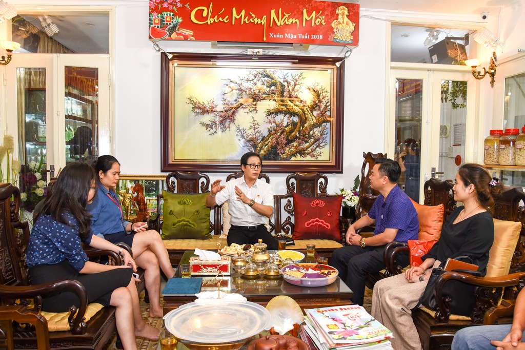 Doanh nhân Nhân Ái cho DNVH .Vũ Minh Châu (áo trắng) chia sẻ những triết lý về cuộc sống: “Doanh nhân là phải biết giúp đỡ những người kém may mắn, biết giúp người khác vươn lên trong cuộc sống”