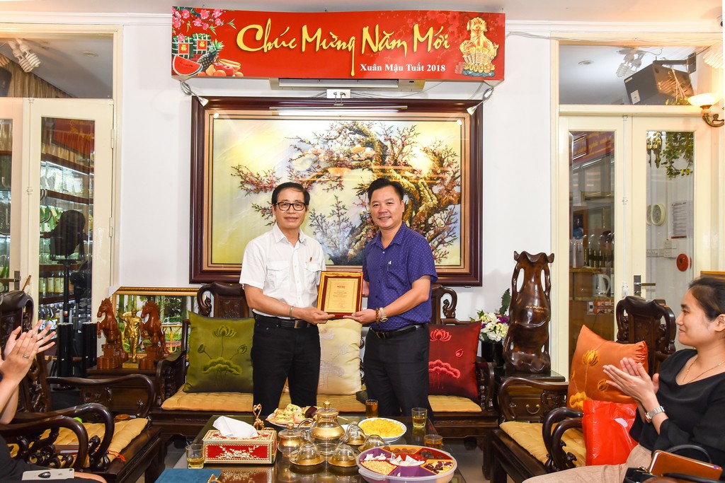 Ông Nguyễn Sỹ Trường (áo xanh) - Thay mặt báo điện tử Nhân đạo và Đời sống, TW Hội CTĐ Việt Nam, Chủ tịch Hội CTĐ TP. Hà Nội đã trao tặng biểu trưng Doanh nhân Nhân Ái cho DNVH Vũ Minh Châu.