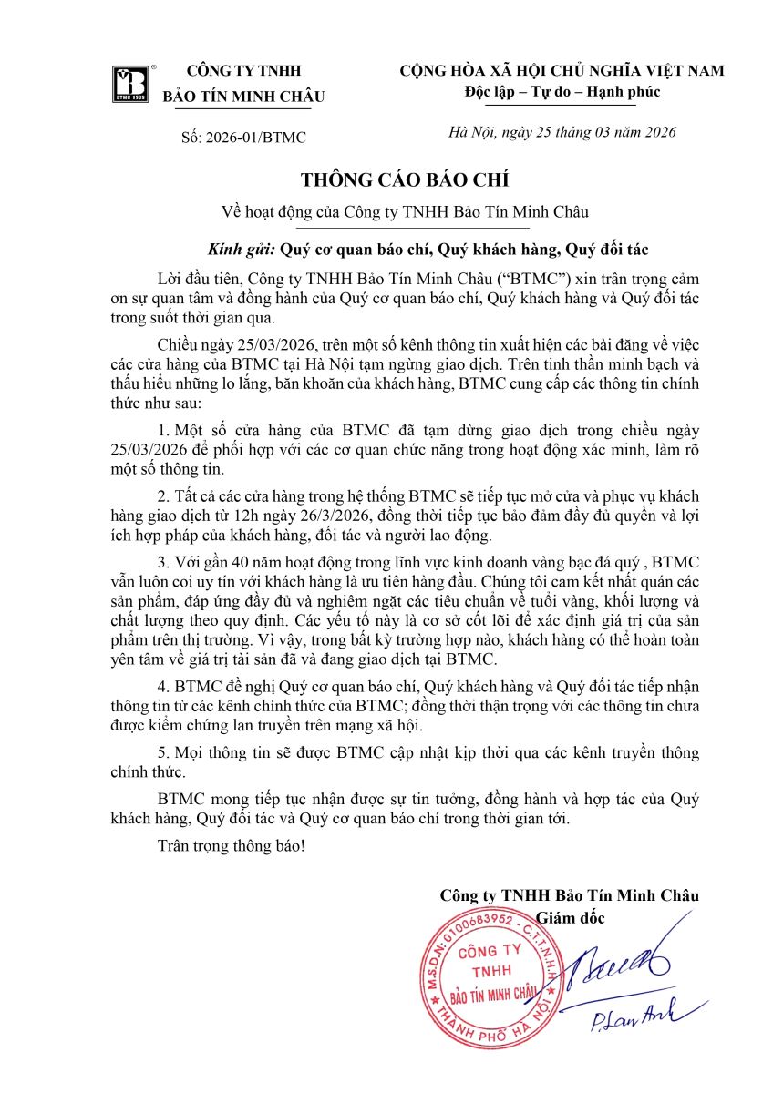 Thông cáo báo chí về hoạt động của Công ty TNHH Bảo Tín Minh Châu