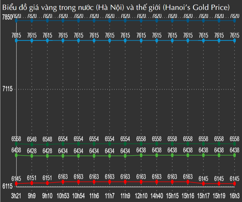 Đồ thị giá vàng thế giới trong phiên hôm nay có hướng đi lên xuống,biến động tại từng thời điểm trong ngày. Cùng chiều với thế giới, đồ thị giá vàng SJC có hướng đi ngang ổn định và Vàng Rồng Thăng Long có hướng đi ngang, biến động lên xuống tại từng thời điểm trong ngày.
