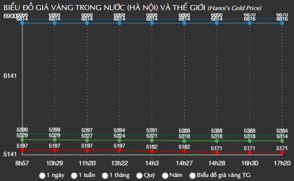 Vào thời điểm 16h30, đồ thị giá vàng thế giới tiếp tục giảm xuống mức 51,71 triệu đồng/lượng, giá vàng giảm tất cả 280.000 đồng/lượng so với thời điểm 13h22.