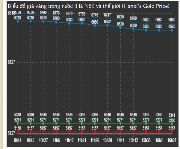 Tới 16h27 đồ thị giá vàng tăng nhẹ chiều mua vào lên mốc: 65,85 – 66,80 triệu đồng/lượng (MV- BR), tăng 50.000 đồng/lượng chiều mua vào và giữ nguyên chiều bán ra so với thời điểm liền trước.