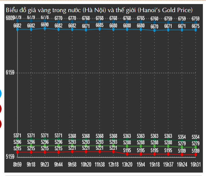 Tới thời điểm 16h31 đồ thị giảm xuống mốc: 66,75 – 67,59 triệu đồng/lượng (MV-BR), giảm 100.000 đồng/lượng chiều mua vào và giảm 90.000 đồng/lượng chiều bán ra so với chốt phiên hôm qua.