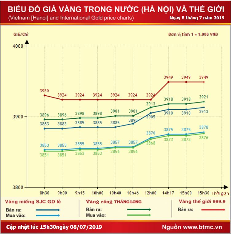 Đồ thị giá vàng giao dịch trong phiên giao dịch 15h chiều giao dịch quanh ngưỡng: 38,75 – 39,10 triệu đồng/lượng, giá vàng tăng  50.000 đồng/lượng ở chiều mua vào và bán ra. Tiếp đó, giá vàng có xu hướng duy trì quanh mốc này cho đến chốt phiên giao dịch.