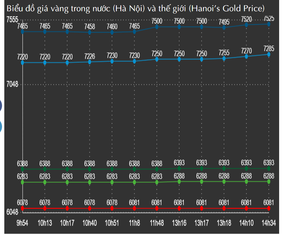 Tại thời điểm 14h34, đồ thị giá vàng biến động tăng nhẹ: 72,85 - 75,25 triệu đồng/lượng (MV-BR), tăng 150.000 đồng/lượng ở chiều mua vào, và tăng 50.000 đồng/lượng ở chiều bán ra.