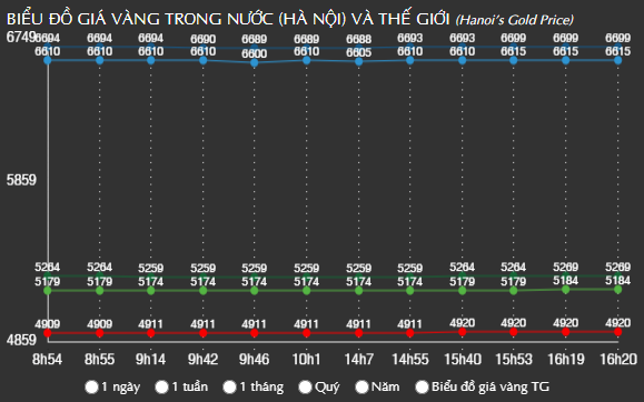 Vào thời điểm 15h53 – 16h20 đồ thị giá vàng biến động tăng nhẹ lên mốc: 66,15 – 66,99 triệu đồng/lượng (MV-BR), tăng 50.000 đồng/lượng ở chiều mua vào và tăng 60.000 đồng/lượng chiều bán ra.