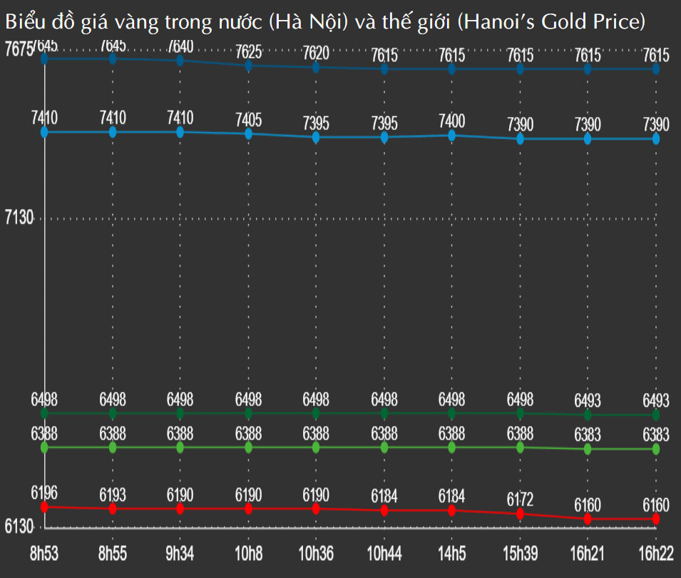 Vào 15h39 - 16h22 đồ thị giá vàng giao dịch tại mốc: 73,90 - 76,15 triệu đồng/lượng (MV-BR), giảm 100.000 đồng/lượng ở chiều mua vào.