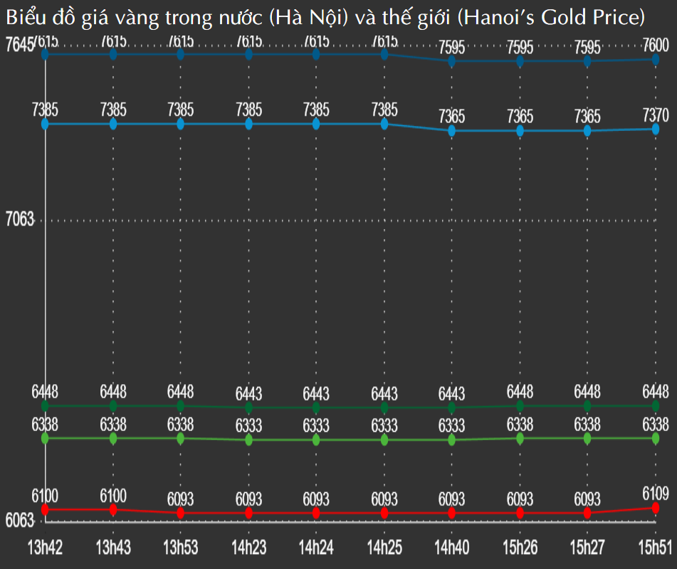 Tại 15h26 - 15h51, đồ thị giá vàng giao dịch tại mốc: 63,38- 64,48 triệu đồng/lượng, tăng 50.000 đồng/lượng ở cả hai chiều.
