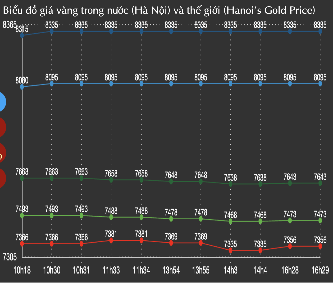 Tại thời điểm 10h30 - 16h39, đồ thị giá vàng biến động tăng nhẹ và giao dịch quanh mốc: 80,95 – 83,35 triệu đồng/lượng (MV-BR), giá vàng tăng 150.000 đồng/lượng chiều mua vào ở và tăng 200.000 đồng/lượng chiều bán ra.