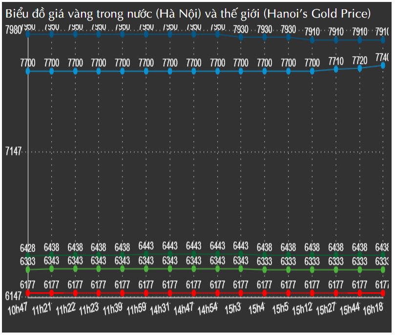 Thời điểm 10h47 - 16h18, đồ thị giá vàng giao dịch tại mốc: 61,77 triệu đồng/lượng.