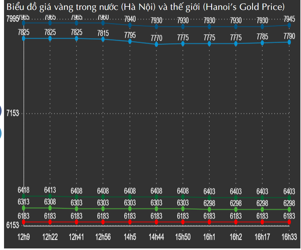 Tại 16h02 - 16h17, đồ thị giá vàng biến động tăng nhẹ lên mốc: 77,85 - 79,30 triệu đồng/lượng (MV-BR), tăng  100.000 đồng/lượng ở chiều mua vào.