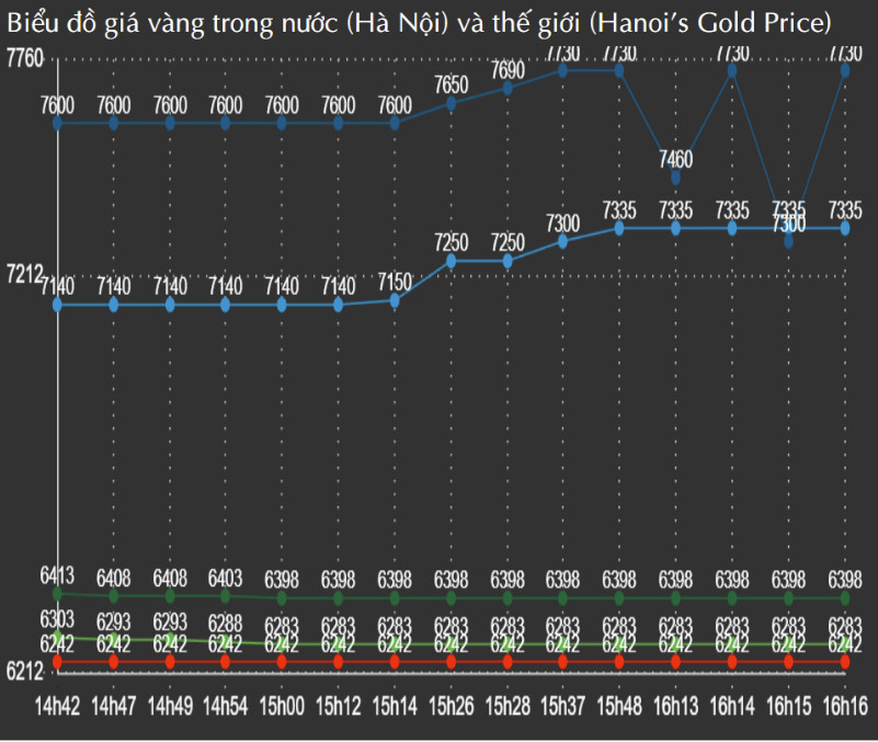 Tại thời điểm 16h14, đồ thị giá vàng biến động tăng mạnh lên mốc 73,35 - 77,30 triệu đồng/lượng (MV-BR), tăng 270.000 đồng/ lượng ở chiều bán ra
