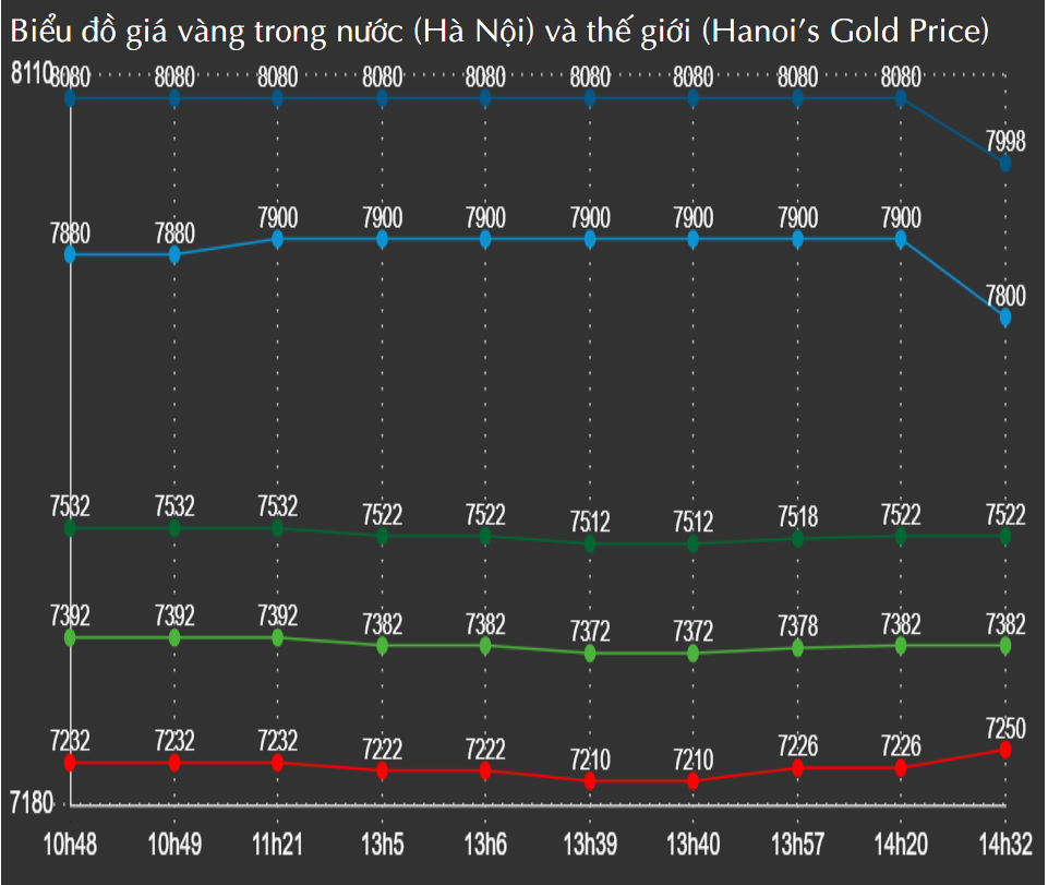 Tại thời điểm 14h32, đồ thị giá vàng giao dịch tại mốc: 78.00 - 79,98 triệu đồng/lượng (MV-BR), giảm 1.000.000 đồng/lượng ở chiều mua vào và giảm 820.000 đồng/lượng ở chiều bán ra.