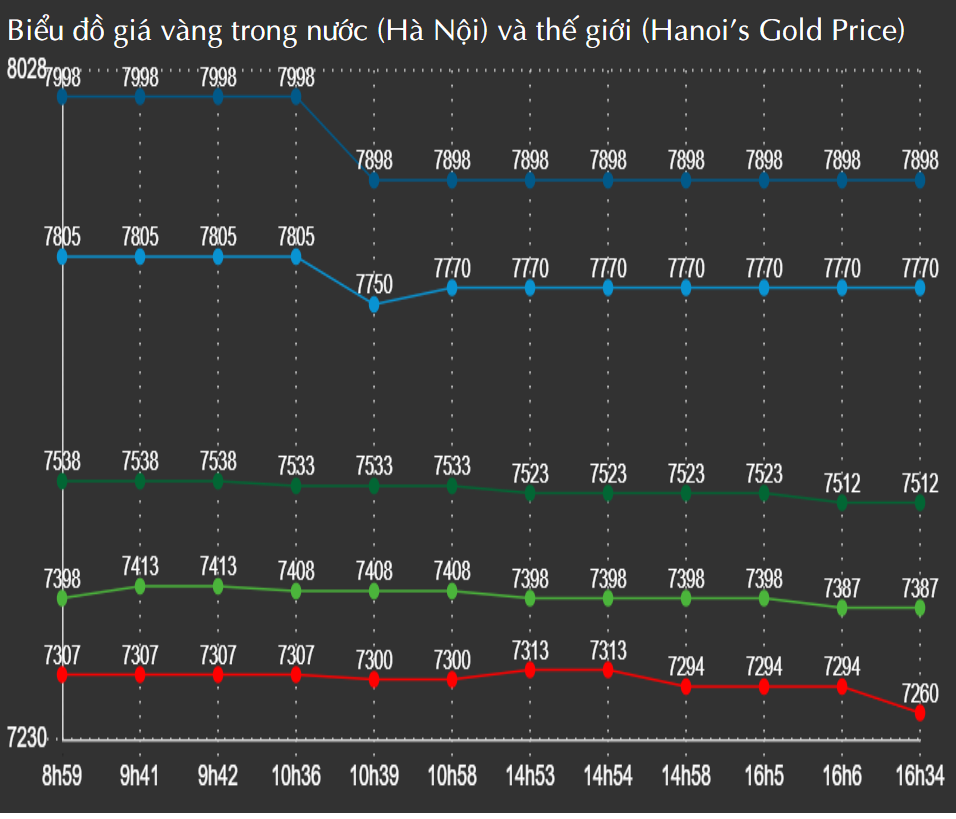 Đồ thị giá vàng thế giới trong phiên hôm nay có biến động đi lên, xuống biến động tại từng thời điểm trong ngày. Cùng chiều với thế giới, đồ thị giá vàng SJC có biến động theo hướng đi lên, xuống và Vàng Rồng Thăng Long có biến động theo hướng đi lên, xuống tại từng thời điểm trong ngày.