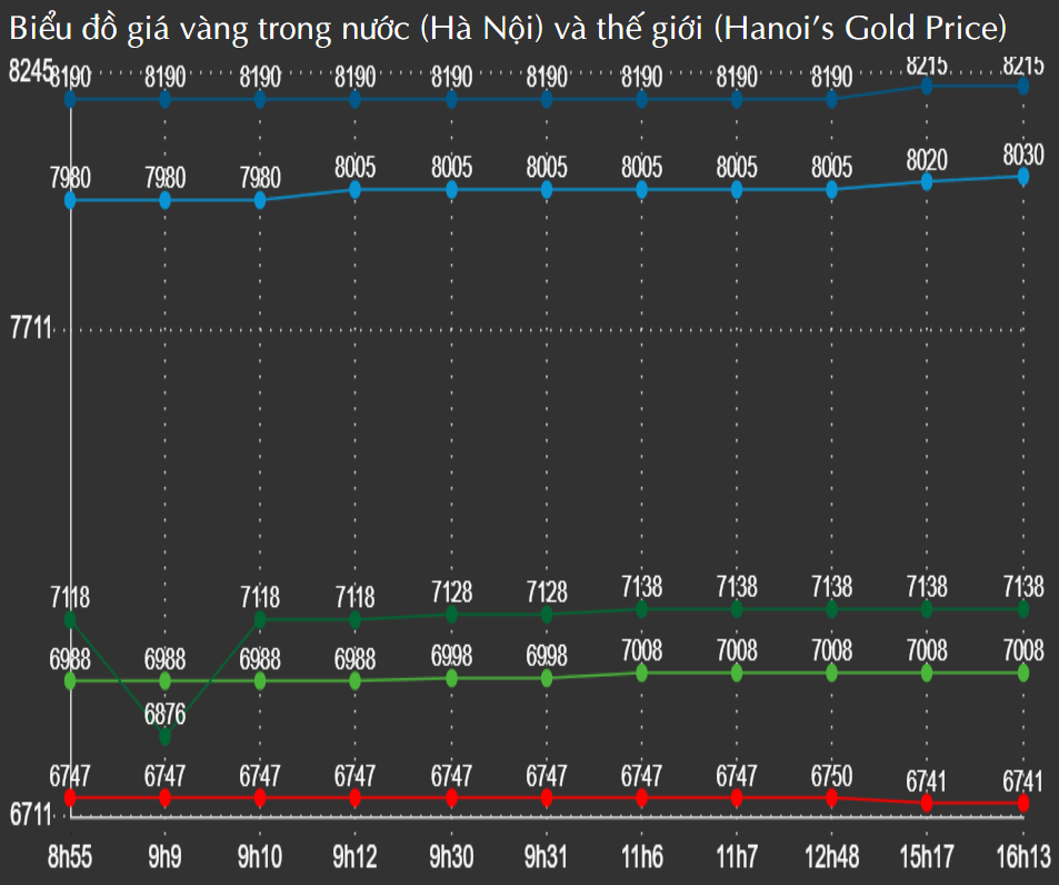 Vào thời điểm 16h13, đồ thị giá vàng giao dịch tại mốc: 80,30 - 82,15 triệu đồng/lượng (MV-BR), tăng 100.000 đồng/lượng ở chiều mua vào.